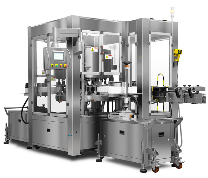 This machine is basically used for gluing paper labels onto the bottles. The cam-based chamber mechanism transfers the paper label from the rack on ‘magazine’ to the assembly where the glue is applied to the backside of label by gum roller and then it is passed onto the bottle and then pressed by rollers.